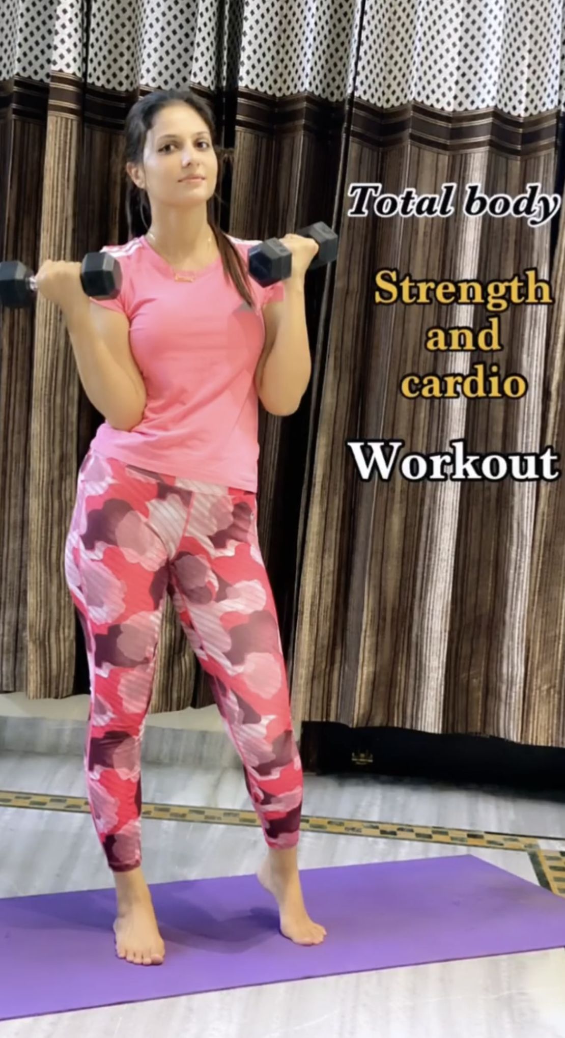 This workout session includes warm up, cardio exercises, strength training and stretching exercises. This class is specially for women who cannot go to gym. They can enjoy perfect workout session at home. All they need is two dumbbells according to their strength and an exercise mat.